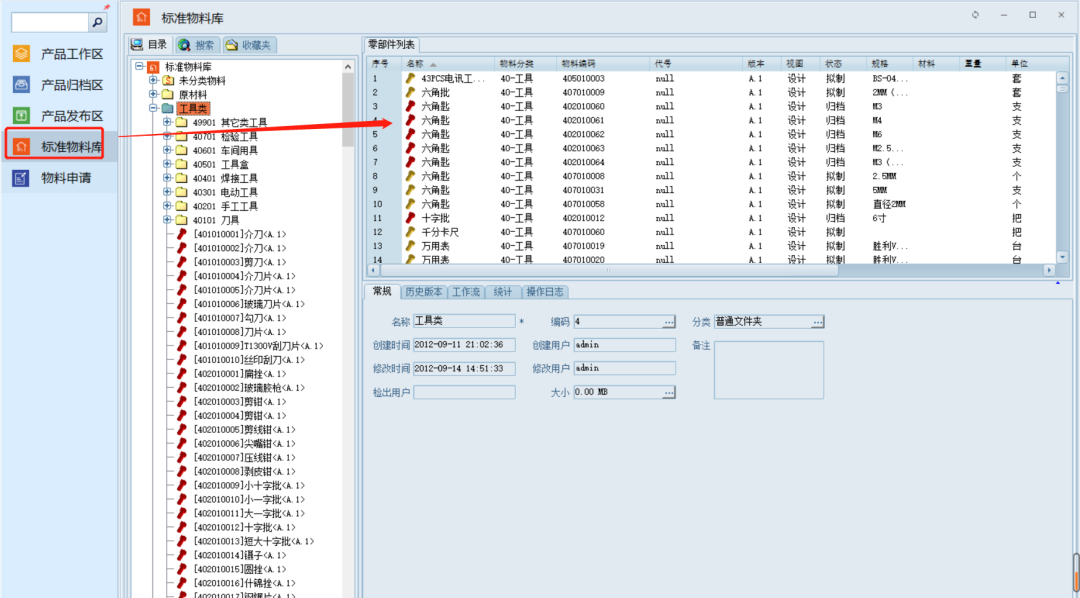 在PLM系统的产品数据管理模块中,根据企业的实际需求和分类标准,分别建立标准库,通用件库等,由专人负责管理维护。研发人员可以直接在系统中调用库文件数据,以提高设计的标准化、通用化、系列化和模块化,实现快速响应产品多样性的需求,大大提高设计效率,缩短研发周期。如下图: