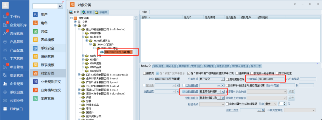 在形成符合规则的物料编码时,还需要设置和绑定各种分类的编码器,才能自动或按条件生成编码。