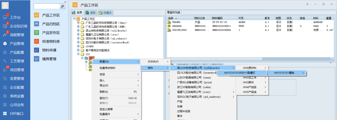 第二种是在产品工作区,右键新建物料时,选择对应分类,生成符合企业规则的物料编码。