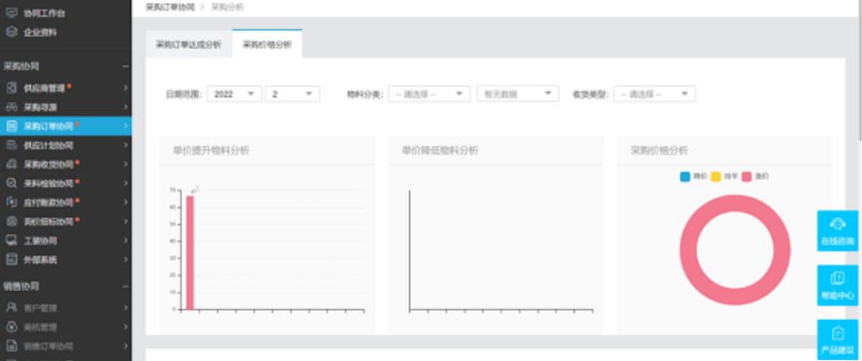 SRM供应商关系管理平台会自动梳理散落在系统的各种物料的报价信息,选出要查询的物料后,系统会自动生成可视化的历史报价分析表,帮助更准确评估报价的变动情况,实打实地把物流中心的工作人员从繁重的报价分析工作中解脱出来。