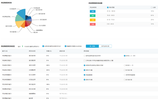SRM供应商关系管理平台从供应商配合能力、交货能力、质量能力、成本能力等多维度,自定义设置了评估供应商的标准权重占比,即可每月定期获取供应商绩效报告,以便及时要求供应商整改,跟进供应商改善情况。