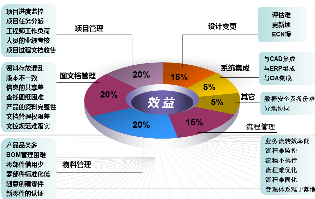 (2) 效益提升:在项目管理、图文档管理、物料管理、流程管理、设计变更以及系统集成等各方面帮助企业全方位提升效益。