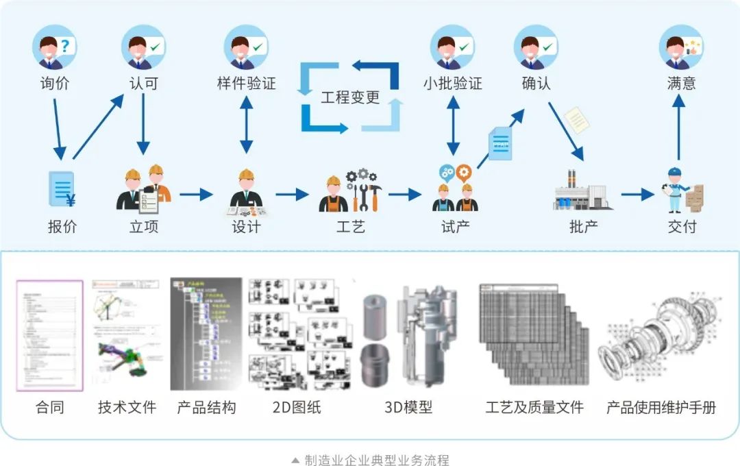 这样的一个完整过程是产品生命周期理念的精髓和管理价值所在,同时在此过程中,必须要解决项目管理视角的数据组织、质量管理体系的建设、与周边ERP系统以及MES系统的信息交互,各种类型BOM数据的转换和流转,交付文档的动态内容出版解决方案,以及需要集成更多种类的工具软件(CAE/CAM)等大量细节问题。