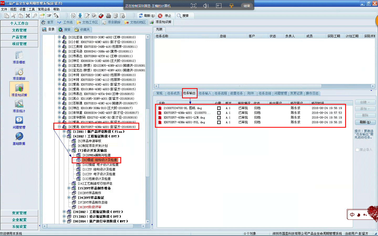 项目文档资料规范管理:“文档管理”模块下与项目实例及项目知识库相关联的项目文档目录库规范管理项目各阶段各任务提交的输出物(开案单、样品申请单、项目开发计划、图纸、BOM表、FMEA等等),保证项目资料的齐套性、规范性,同时方便各环节或部门人员查找、使用与追溯。