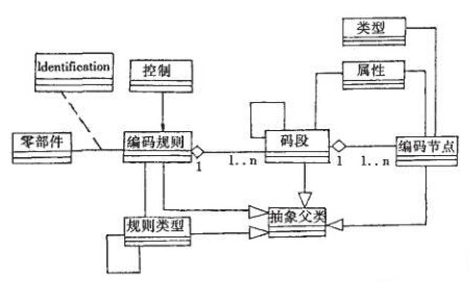 码段和编码节点类与类型和属性类建立底层的关联关系,控制类用来进行编码的检测、回收等工作。Identification类是起到关联类及代码生成器的作用。零部件与某一编码规则建立关联后,可以通过该编码规则为该零部件进行编码的生成。